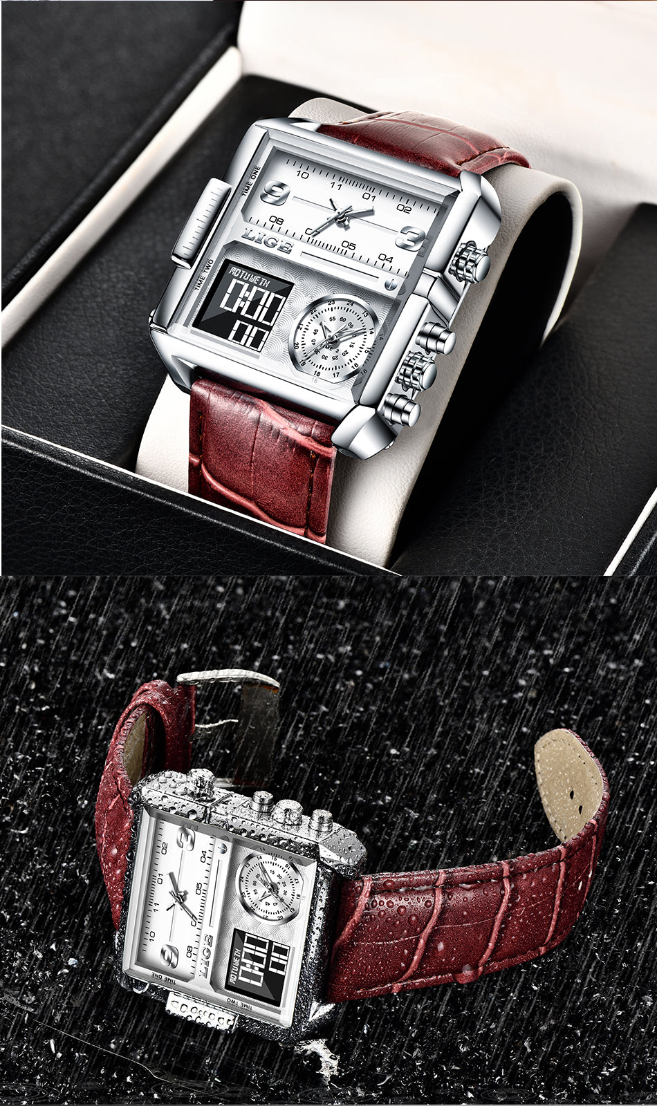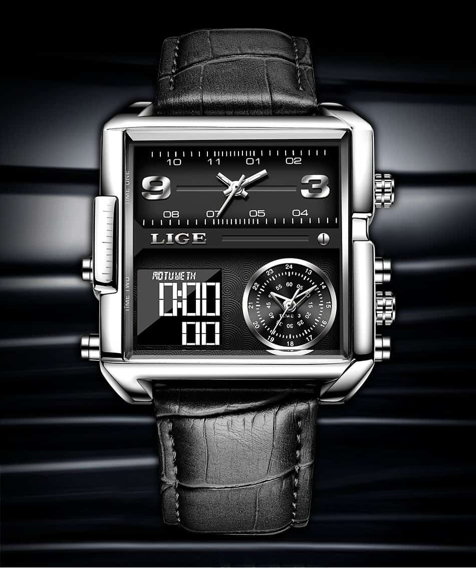 O relógio tem cronômetro, alarme e data. Movimento de quartzo de alta qualidade com display analógico de três fusos horários. É muito conveniente para viajar, você pode ver 3 horários de 3 países em apenas um relógio;